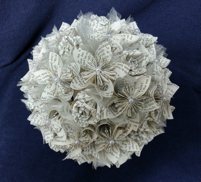 Her work involves meticulous cutting and folding paper by hand, and mounting it into decorative items which can be mounted on a stand or hung on the wall. Some smaller items have practical uses as well as decorative ones, such as her book page boxes. She also produces paper flowers detailed enough to be used in wedding decorations and accessories.