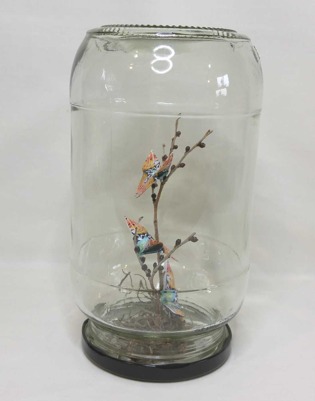 The jar contains three origami butterflies perched on a small branch. They look real cute sitting on a shelf or table.
