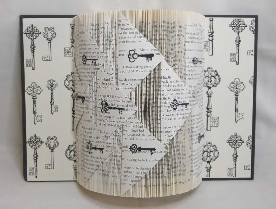 This book is folded into a cylinder shape with random triangle folded pages that have key designs on them, with key print end pages to accent.