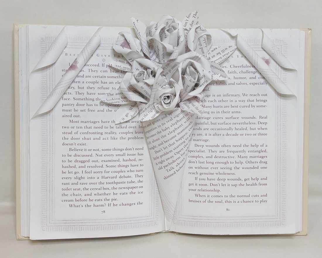 This small bouquet of roses and leaves are arranged in a cone shape vase in the middle of the book with accented curled end pages.