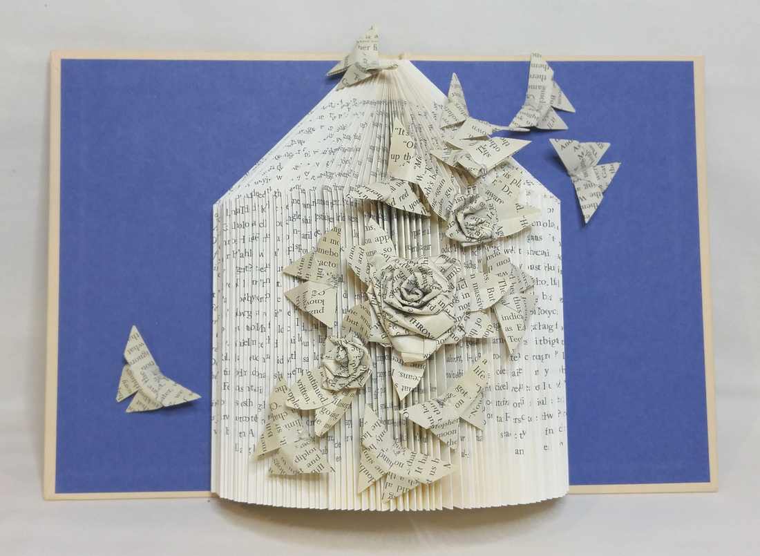 1 ½ inch origami book page butterflies and book page roses with leaves accent a house shape folded book